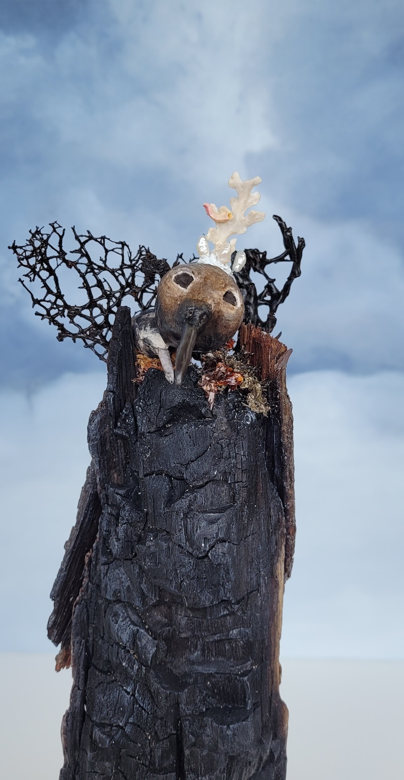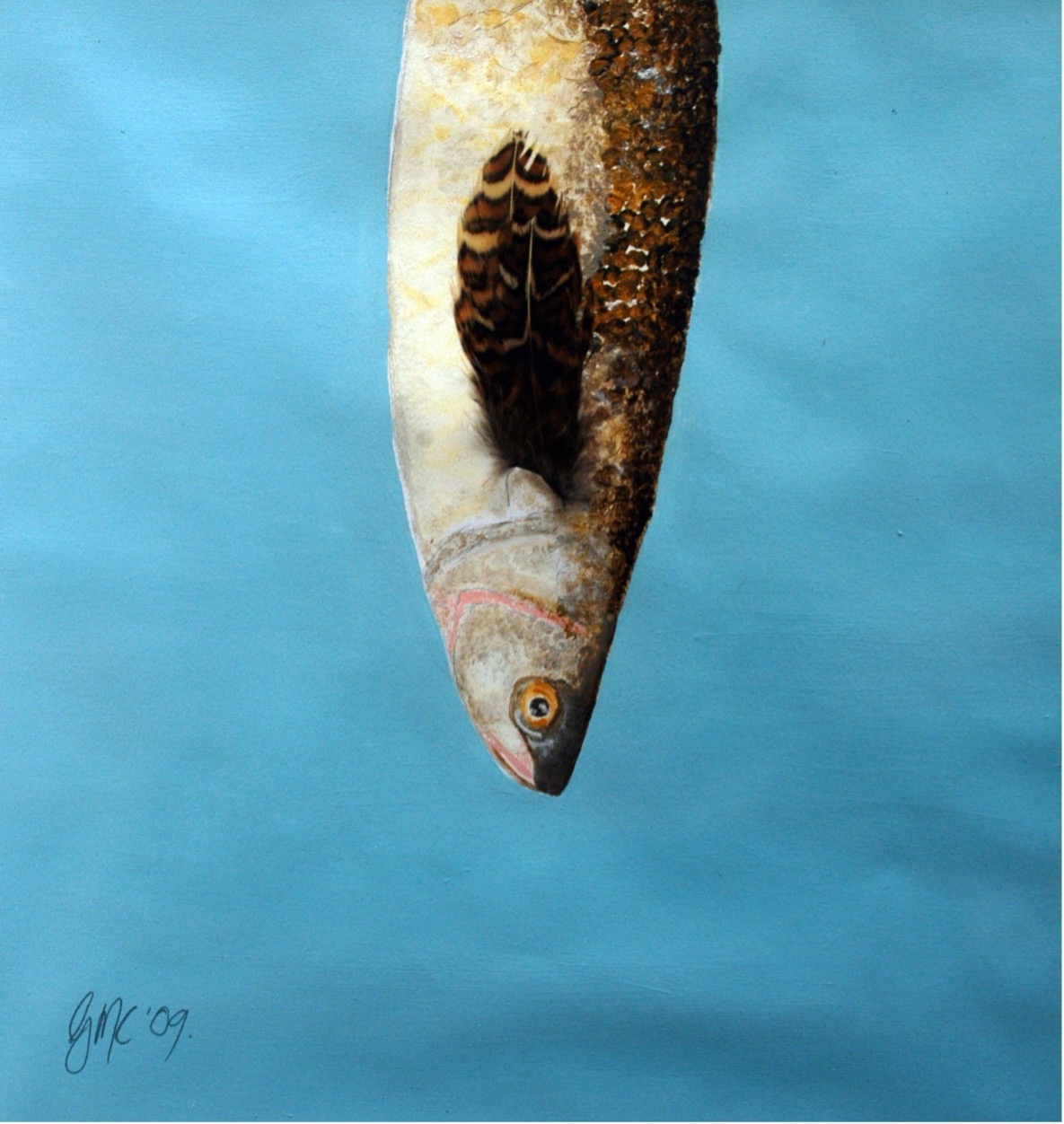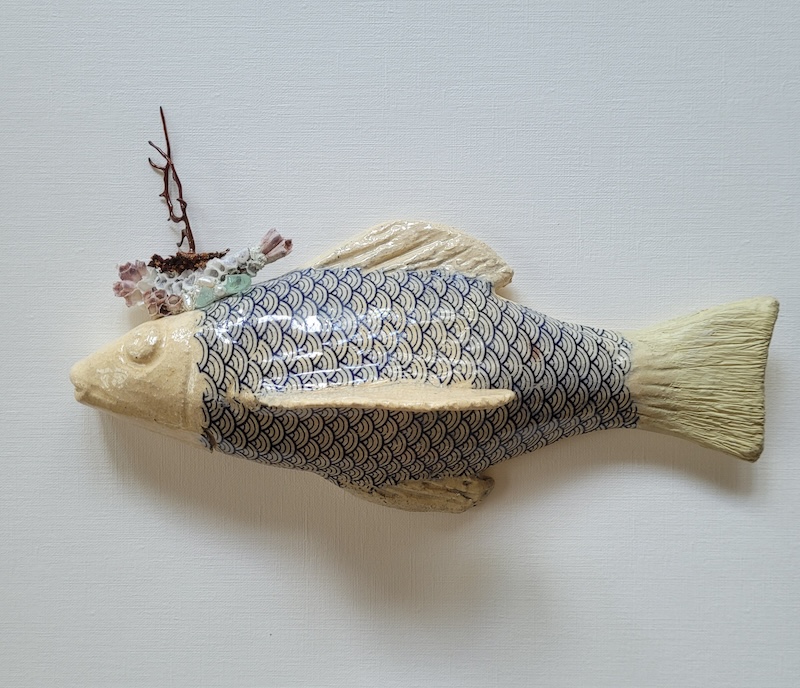 The body of artwork contains a collection of paintings, migratory bird sculptures and ceramic fish.