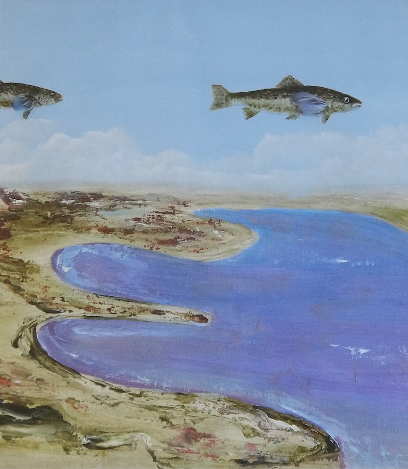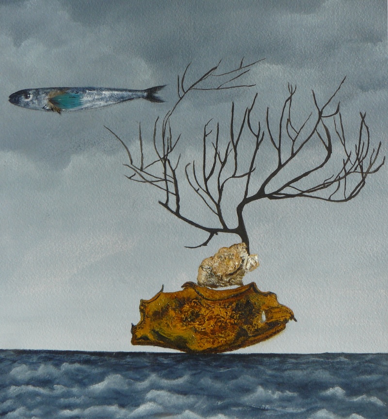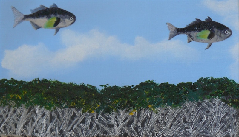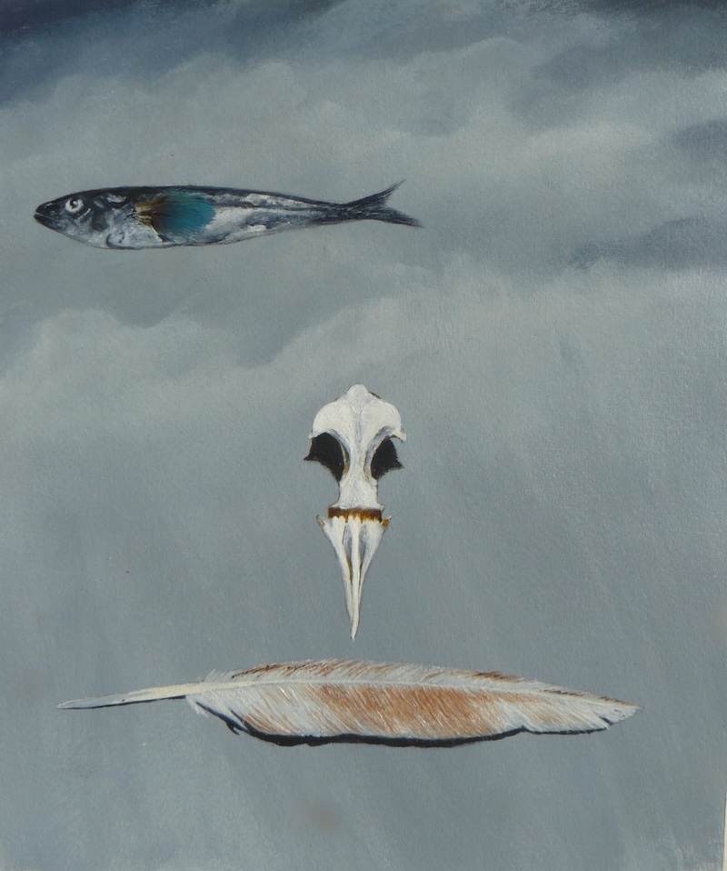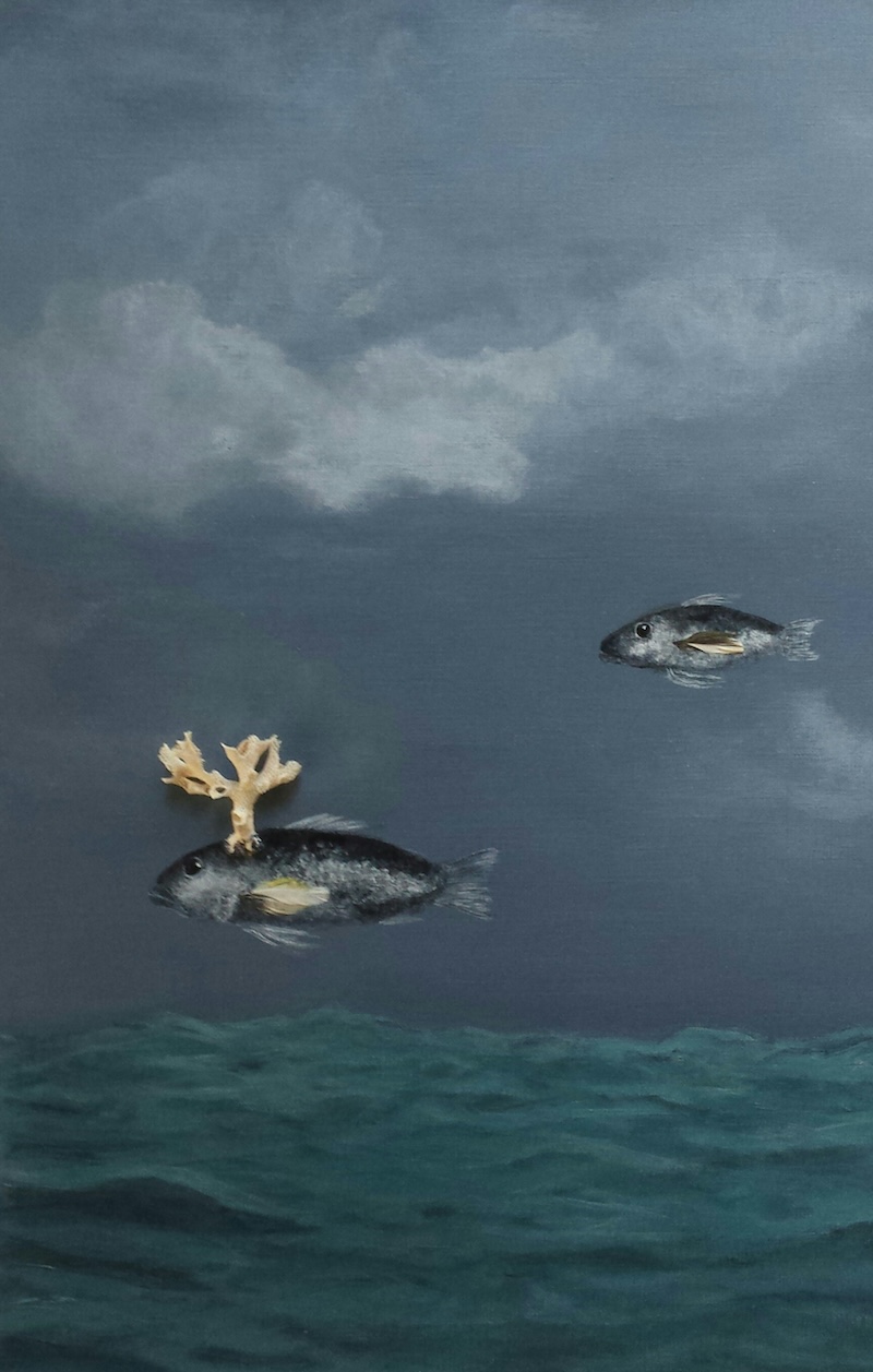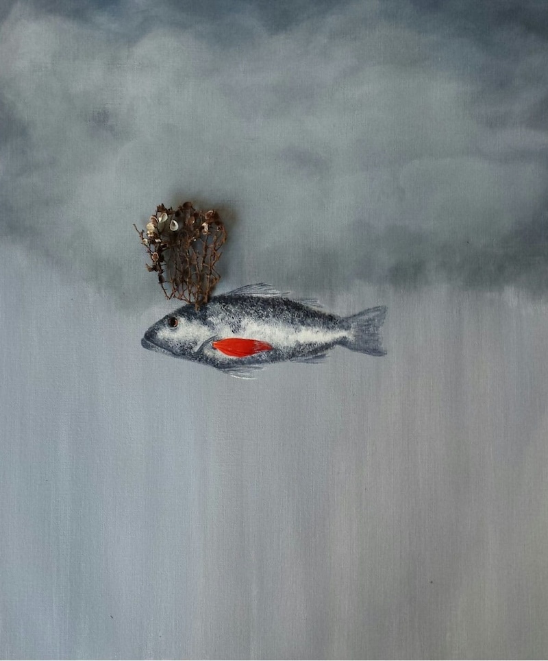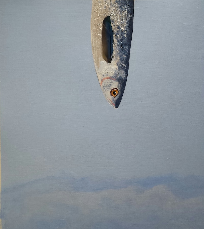 In the “Flying Fish” series there is a longing in the fish to take flight above the ocean, borrowing discarded wing feathers from birds that hover above the dunes. The paintings are travelogues, diary notes and poems. Some speak of ceremony. Some are guardians. The fish carry decorative crowns and symbols of home and country from where they have travelled. There is a symbiotic relationship between the fish and the migratory birds.