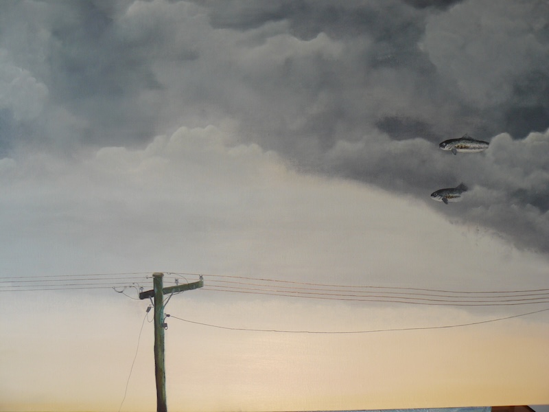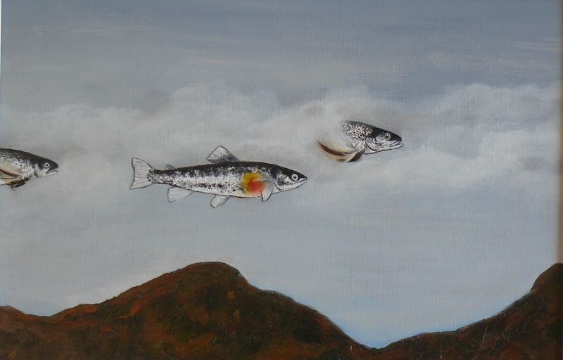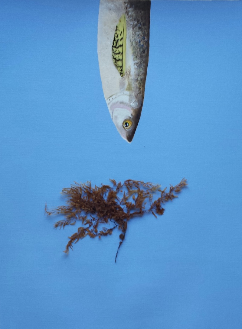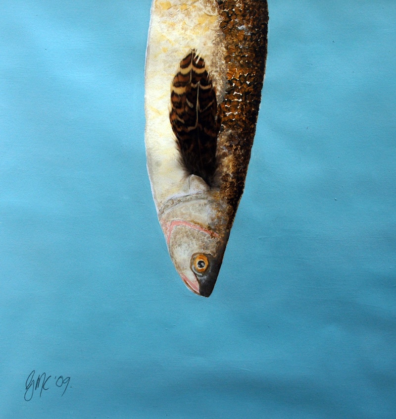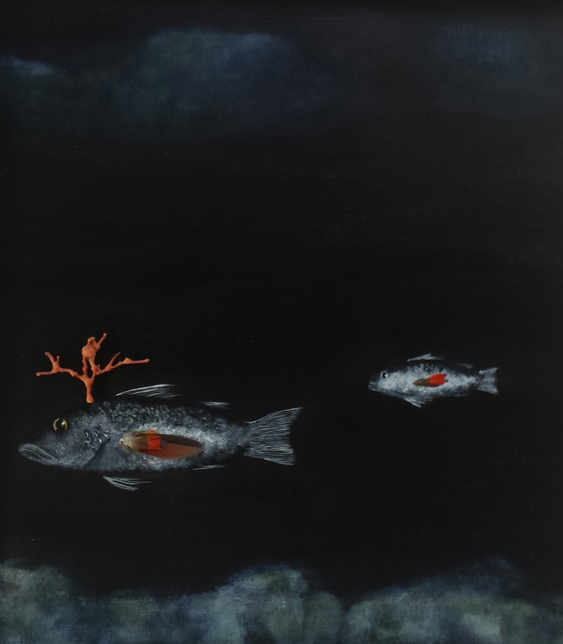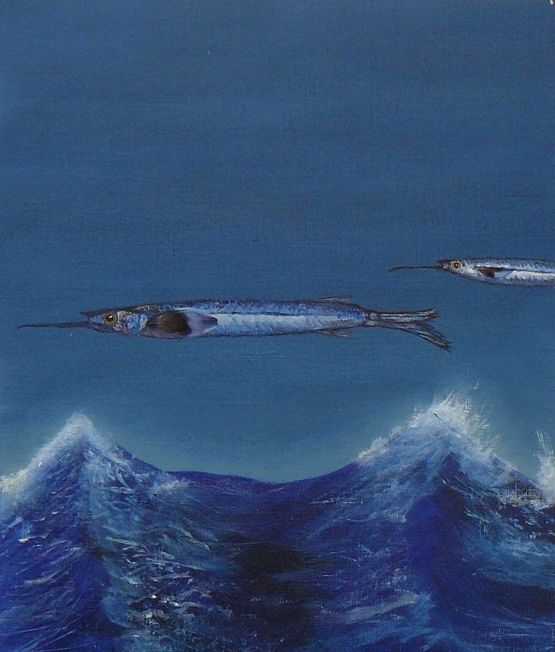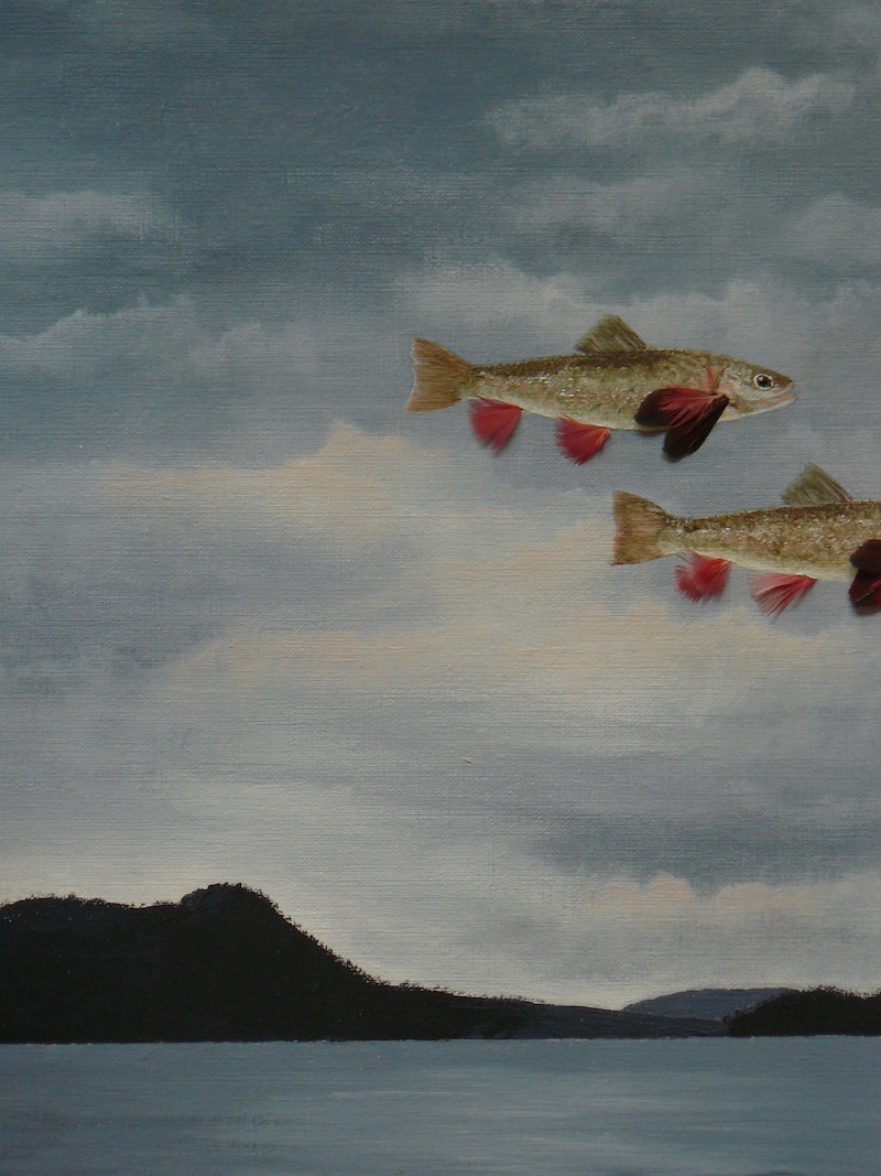 In the “Flying Fish” series there is a longing in the fish to take flight above the ocean, borrowing discarded wing feathers from birds that hover above the dunes. The paintings are travelogues, diary notes and poems. Some speak of ceremony. Some are guardians. The fish carry decorative crowns and symbols of home and country from where they have travelled. There is a symbiotic relationship between the fish and the migratory birds.