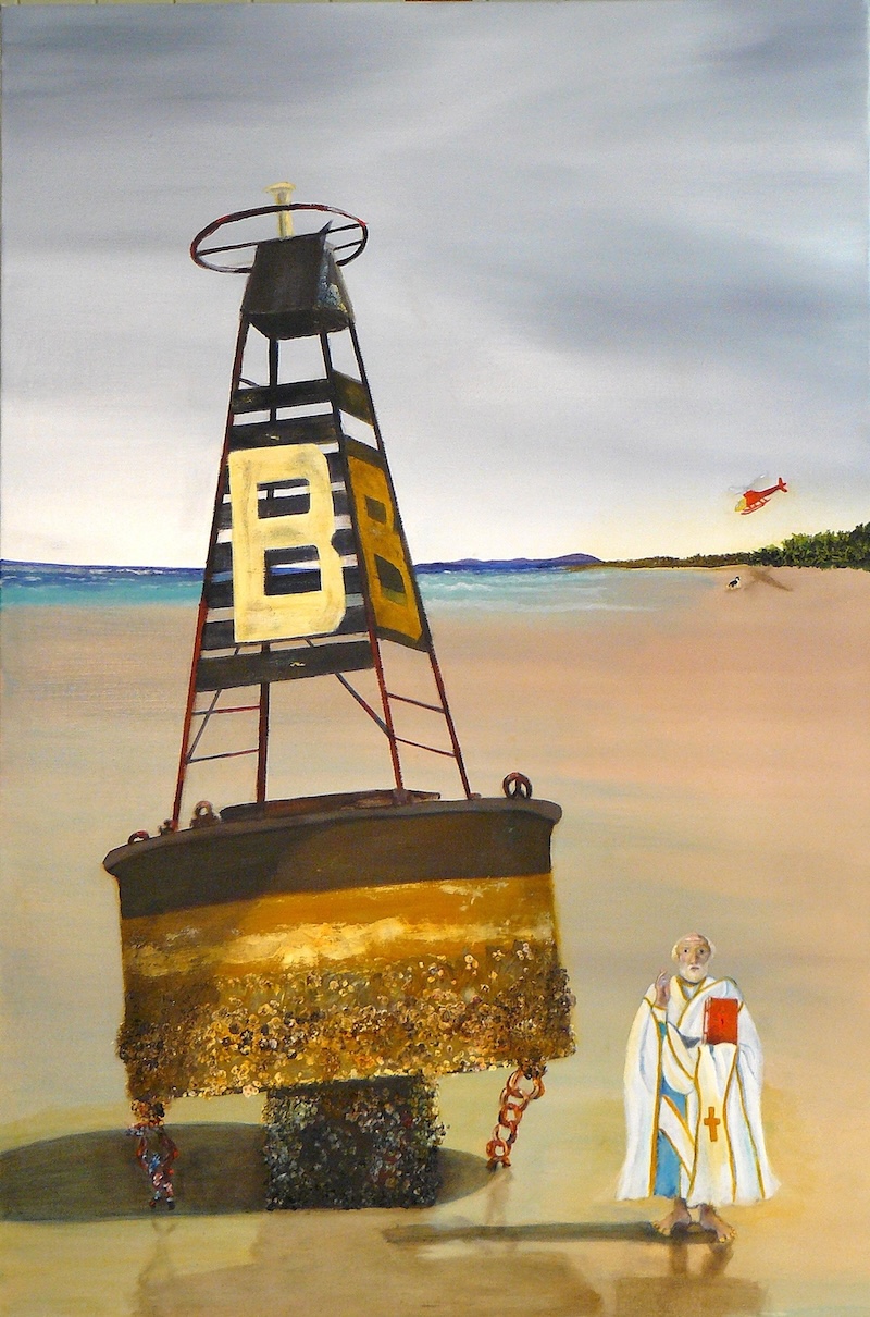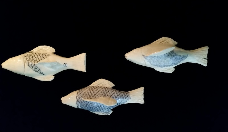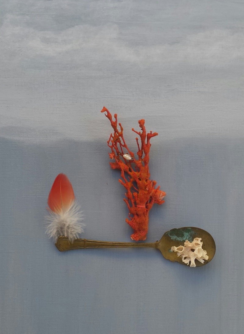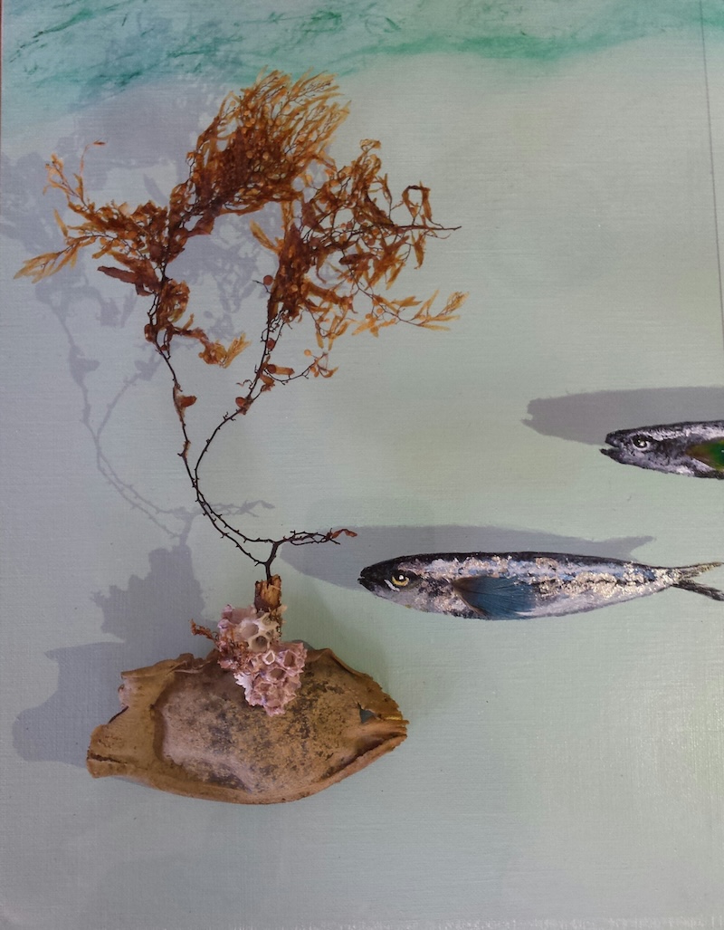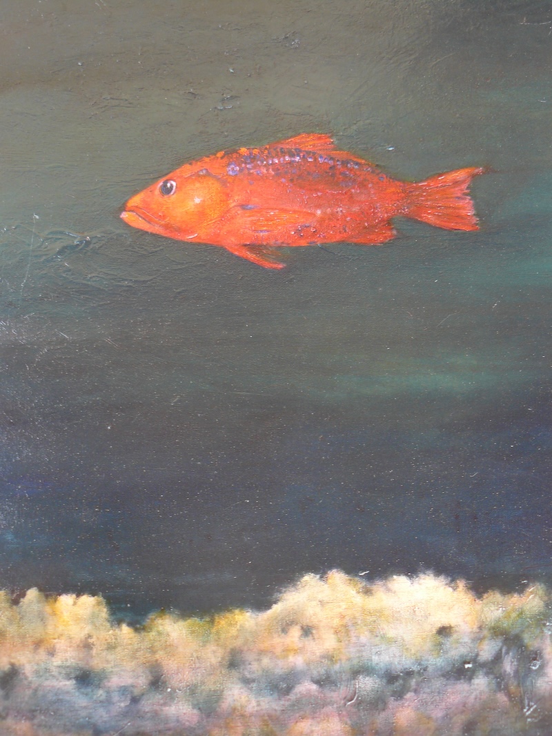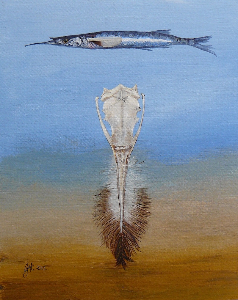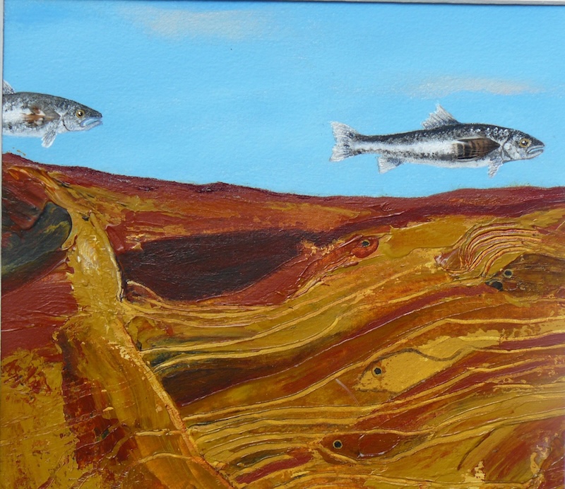 In the “Flying Fish” series there is a longing in the fish to take flight above the ocean, borrowing discarded wing feathers from birds that hover above the dunes. The paintings are travelogues, diary notes and poems. Some speak of ceremony. Some are guardians. The fish carry decorative crowns and symbols of home and country from where they have travelled. There is a symbiotic relationship between the fish and the migratory birds.