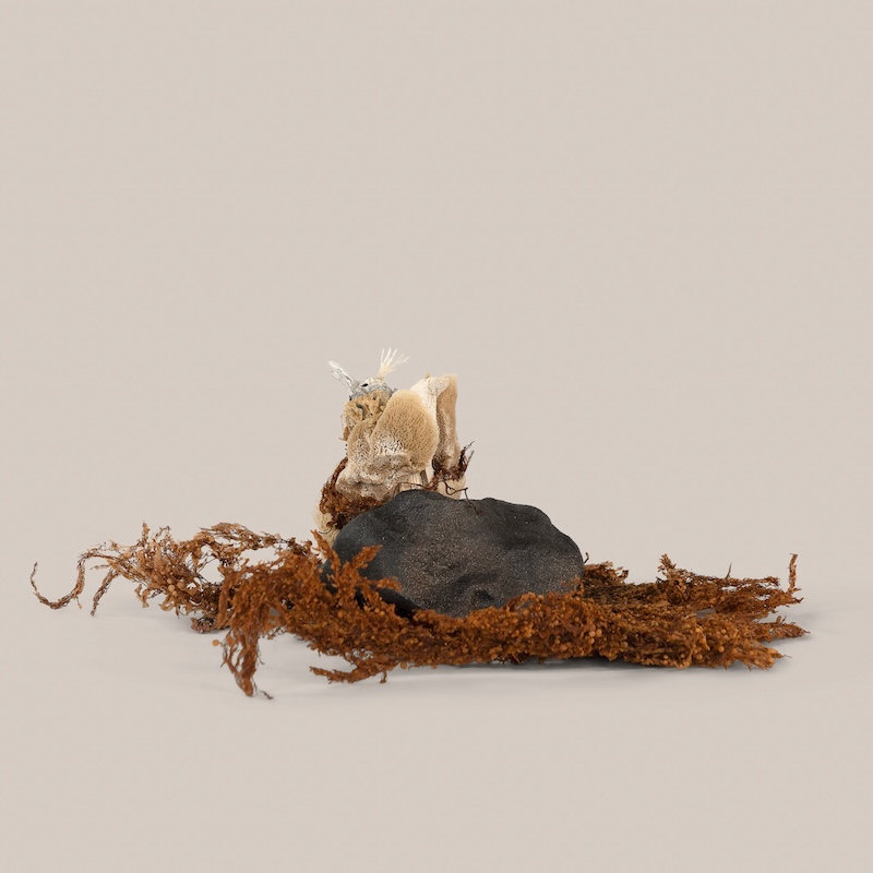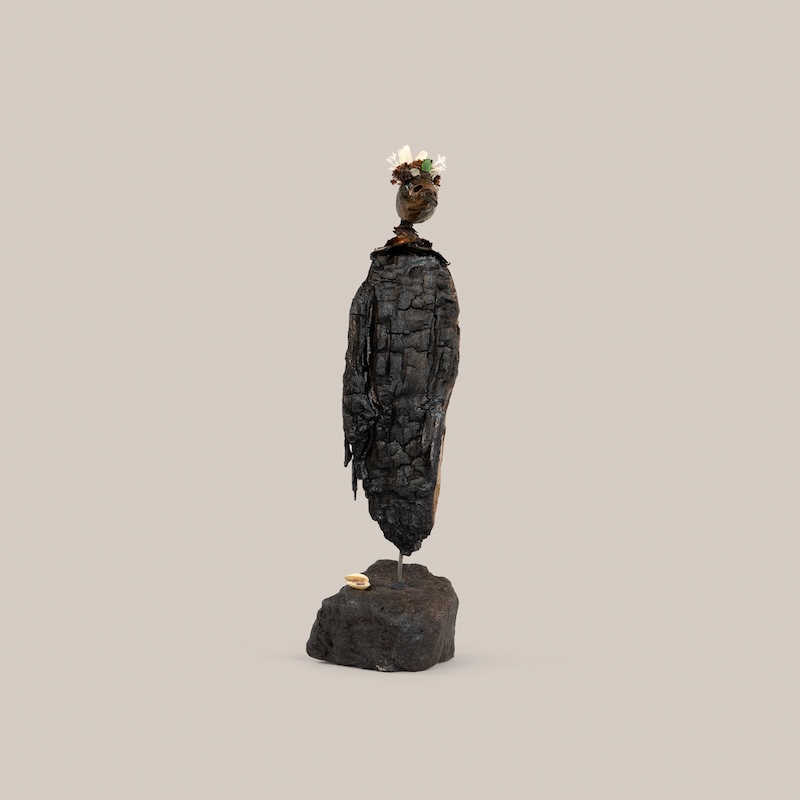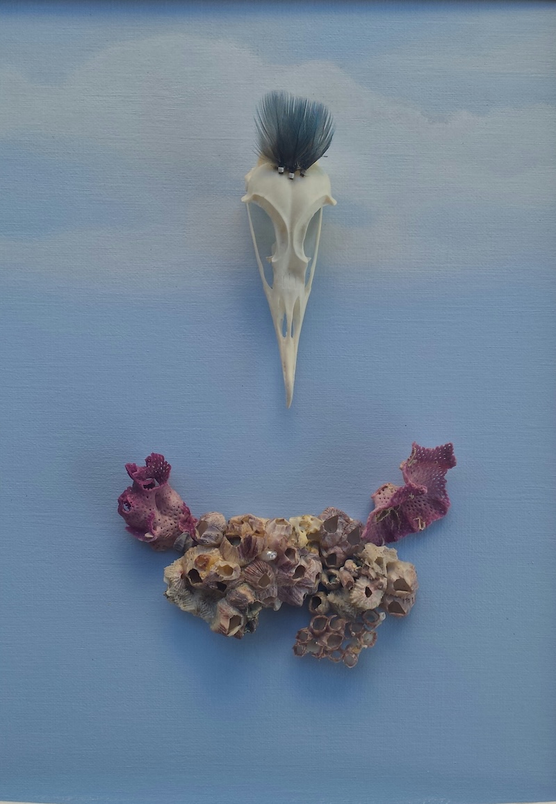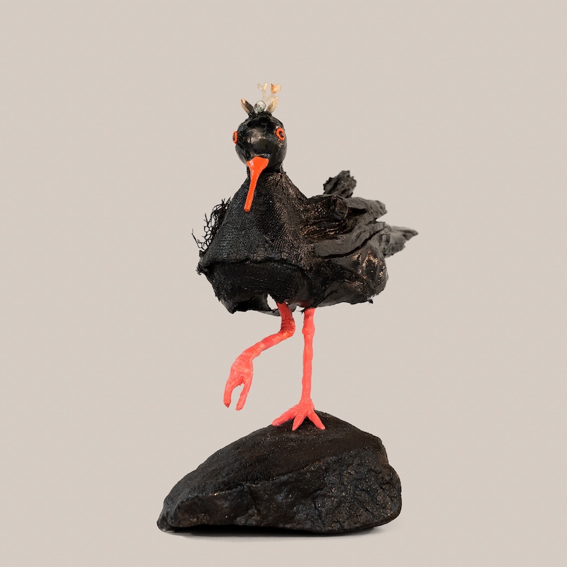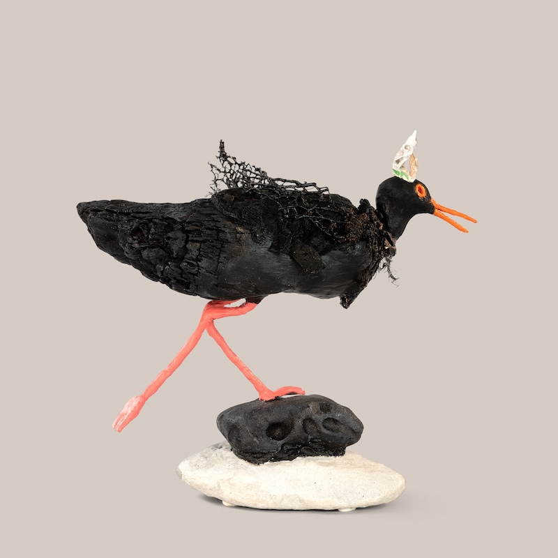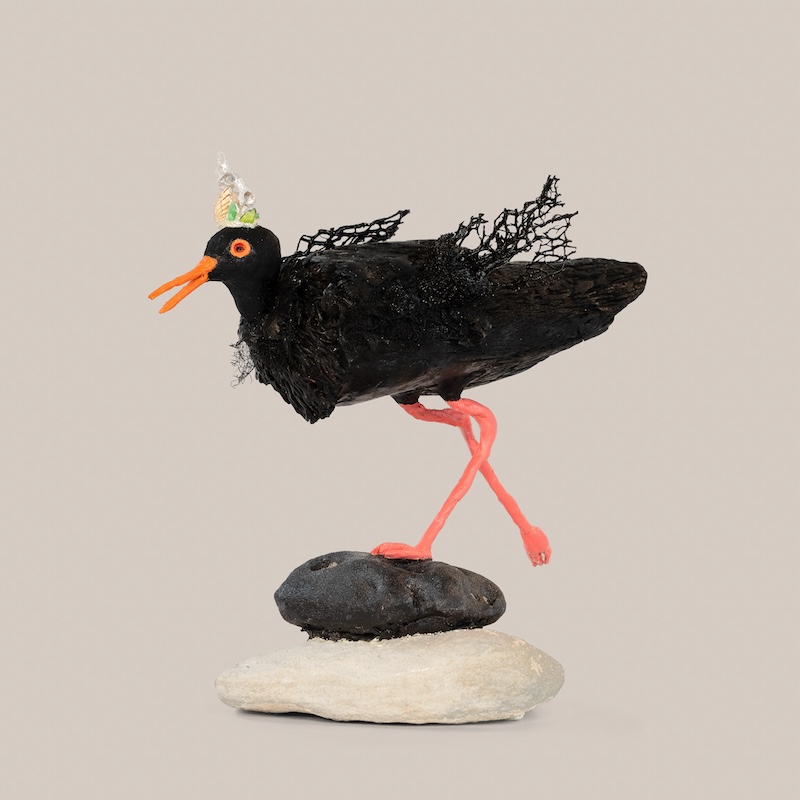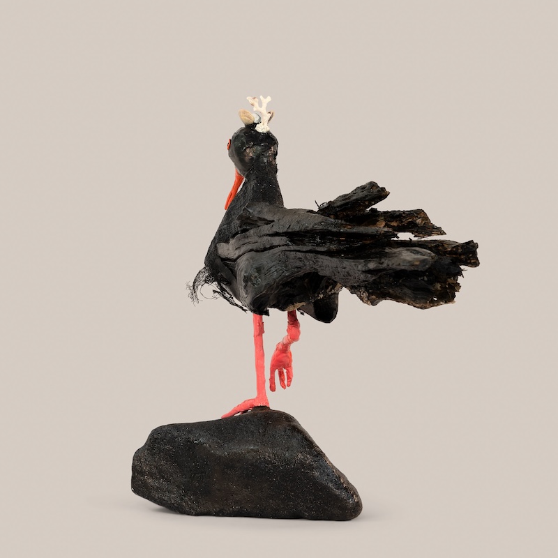 The bird sculptures are made from material washed up on the beach; burnt timber, coral, sea glass, barnacles, shells, seaweed and coffee rock. The birds are adorned with headdresses that symbolise ceremony, place, love and loss.