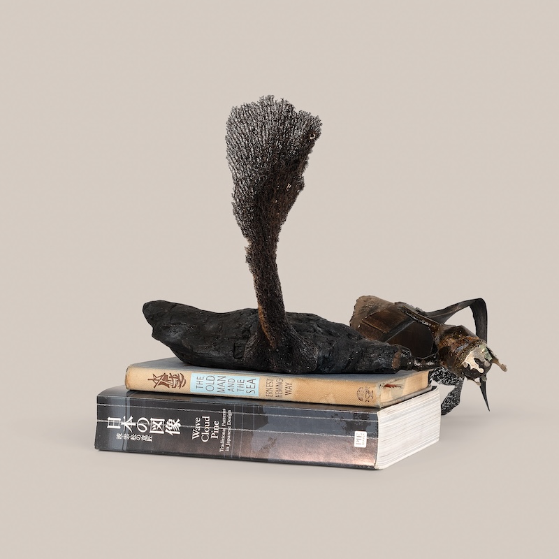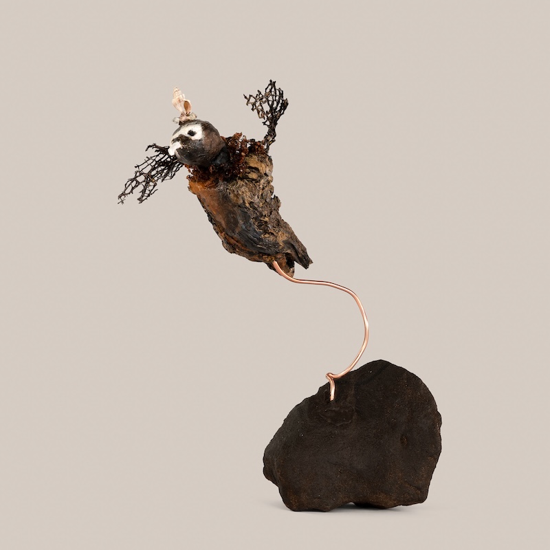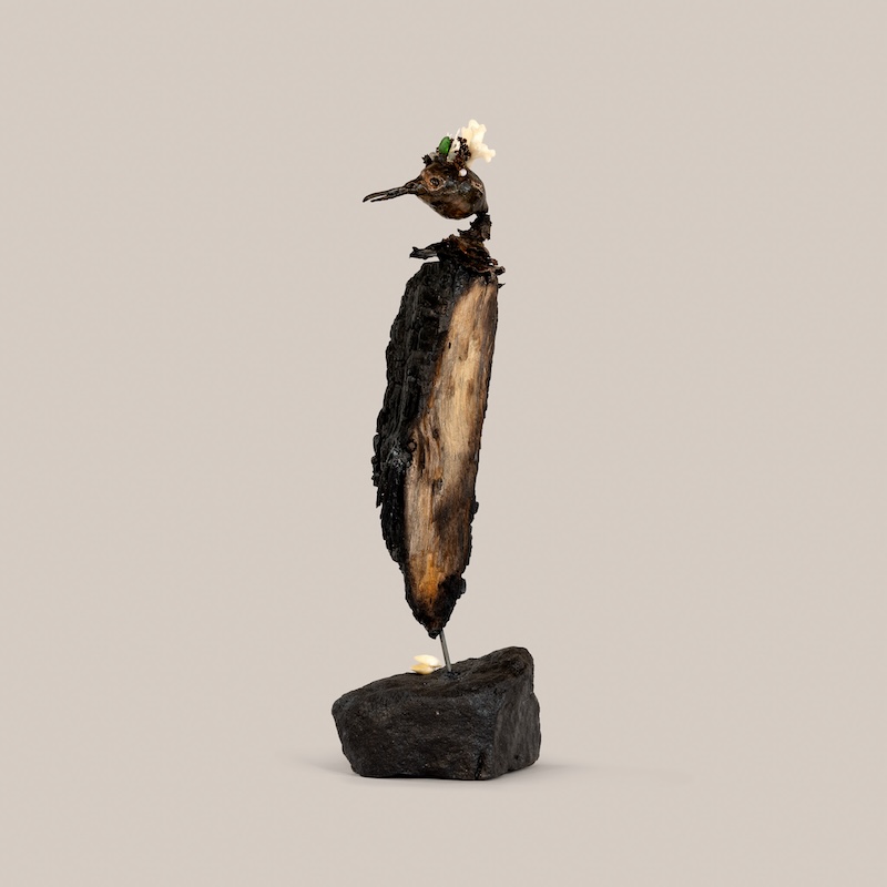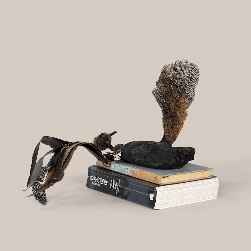 It was devastating to witness thousands of dead and dying birds on the beach. I began researching migratory birds and their flyways. One day when walking on the beach, I found a charred branch from a recent bush fire washed into shallow water and sand. The charred and charcoal texture looked like the feathered body of a bird. I saw such beauty and sadness in this uniquely formed branch, and so began my love affair to create migratory birds.
