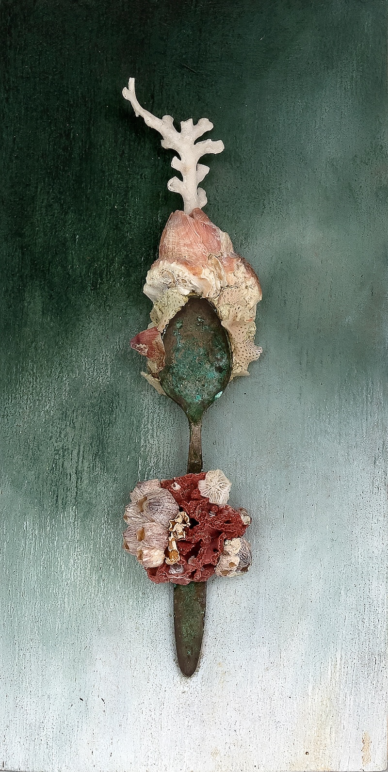 The Judge. Ceramic fish, headdress of pearls, sea glass, coral and sea anemone. 25 cm.